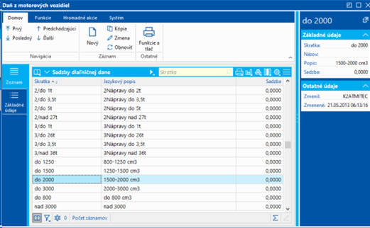 Číselník sadzieb dane z motorových vozidiel je potrebné naimportovať pomocou cesty v stromovom menu: Účtovníctvo – Daň z motorových vozidiel – Základné nastavenie – Import sadzieb číselníka dane z motorových vozidiel.