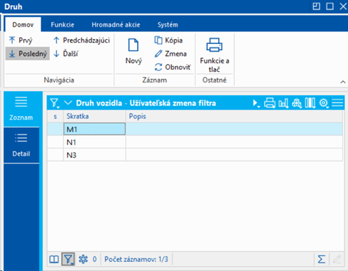 V knihe Druh vozidla je potrebné pomocou klávesy Insert resp. F6 založiť druhy jednotlivých vozidiel L1e až L7e, M1, M2, M3, N1 až N3, O1 až O4. Je postačujúce založiť len tie, ktoré sú v spoločnosti evidované. IS K2 si pri výpočte priznania k dani z motorových vozidiel doplní kategóriu vozidla (prvé písmeno z druhu vozidla) na riadok č. 03. (Kategória vozidla) a určí prípadné zvýšenie alebo zníženie sadzby dane podľa príslušnej kategórie vozidla na riadku priznania č. 13 (Zníženie ročnej sadzby dáme pre kategóriu vozidla). |