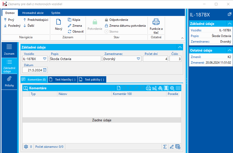 Obr.: Záznamy pre daň z motorových vozidiel – Základné údaje