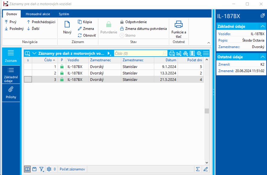 K evidencii doby používania súkromných vozidiel zamestnancov je potrebné jednotlivé jazdy evidovať v knihe Záznamy pre daň z motorových vozidiel, ktorá sa nachádza v stromovom menu: Účtovníctvo – Daň z motorových vozidiel – Daň z motorových vozidiel – Záznamy pre daň z motorových vozidiel.