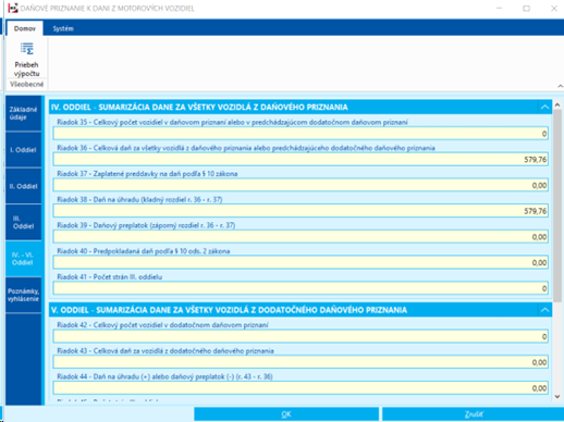 IS K2 automaticky vyplní riadky č. 35 (Celkový počet vozidiel v daňovom priznaní) č. 36 (Celková daň za všetky vozidlá) č. 38 (Daň na úhradu). V prípade dodatočného daňového priznania sa riadky č. 35 a č. 36 kopírujú z vloženého predchádzajúceho daňového priznania. Ak nebolo načítané predchádzajúce daňové priznanie, je potrebné tieto údaje vyplniť ručne.
