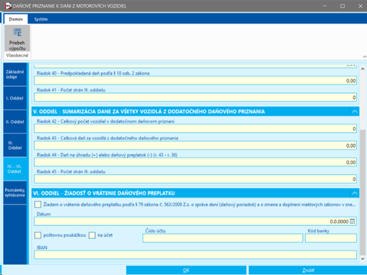 V prípade potreby je pre správne vyplnenie VI. Oddielu potrebné zaškrtnúť možnosť: Žiadam o vrátenie daňového preplatku podľa §79 zákona č. 563/2009 a vyplniť dátum. V ďalšej časti je potrebné vybrať Spôsob platby na ktorý v prípade platby na účet nadväzuje časť Bankový účet, obsahujúci Číslo účtu, Kód banky a IBAN.
