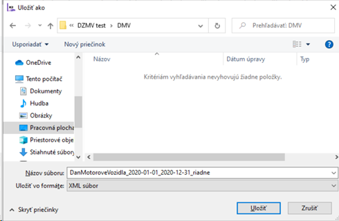 Po vyplnení všetkých potrebných údajov sa zobrazí dialóg pre uloženie vygenerovaného xml súboru. Názov súboru je predvyplnený ale je možné ho ľubovoľne zmeniť. Ak ste na úvodnom formulári zaškrtli voľbu „Otvoriť v eDane“, uložený súbor sa otvorí v programe eDane.